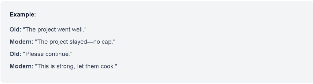 Some slang is about subtlety too. A “soft launch” means revealing something quietly, like posting hints about a new project instead of a big announcement. A “core memory” is an unforgettable moment, like “Closing that deal was a core memory.” When someone is doing great, don’t interrupt, just say “let them cook.” To show you’re serious, people add “no cap,” which means “no lie.” And of course, the classic “slay” is still everywhere, used when someone performs exceptionally well “You slayed that presentation.”